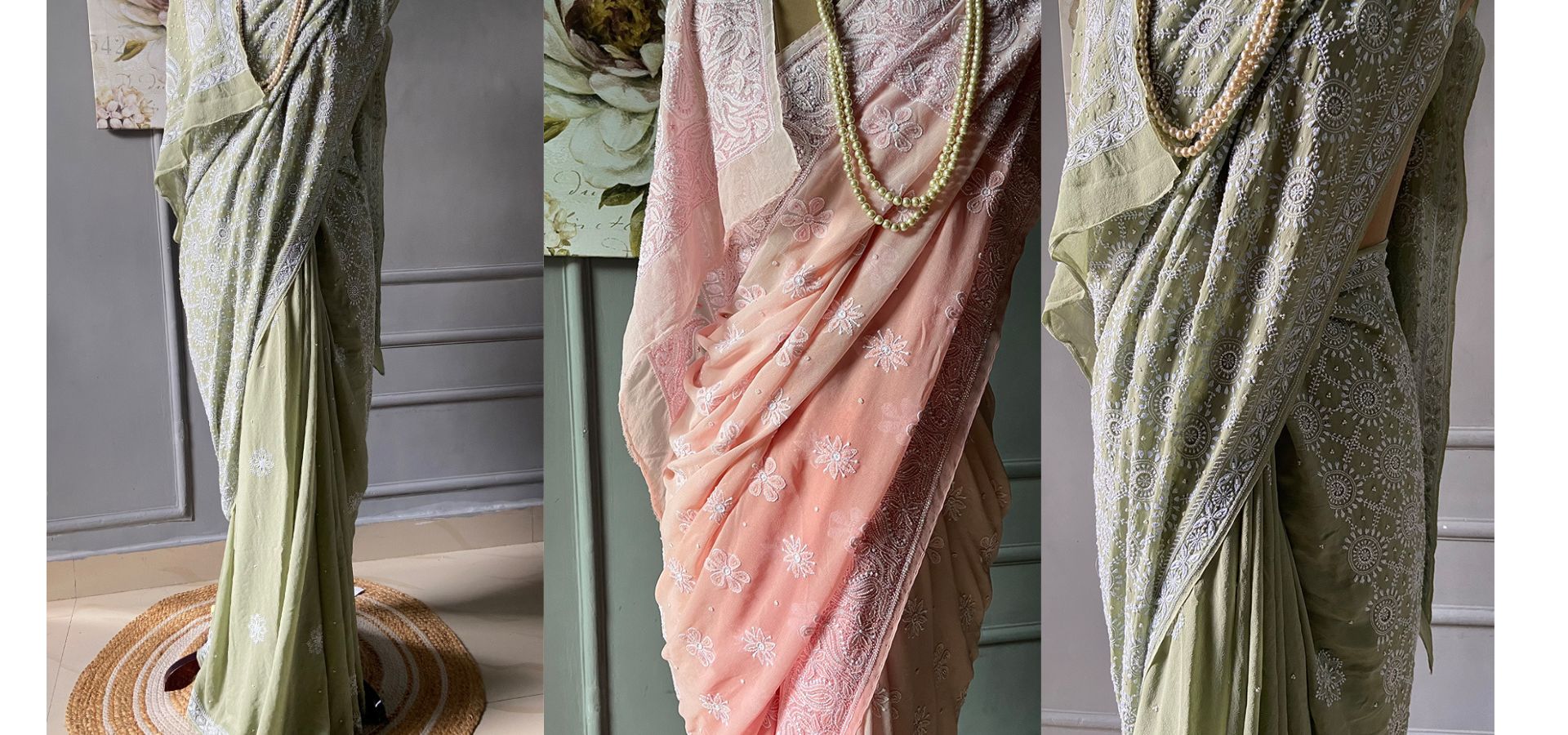 All the saree lovers always keep a handful designs of chikankari sarees with them because their grace is timeless. At Nazrana Chikan we have a wide variety of sarees for all seasons. Chikankari saree is available in fabrics such as cotton, georgette, silk, chanderi and organza.