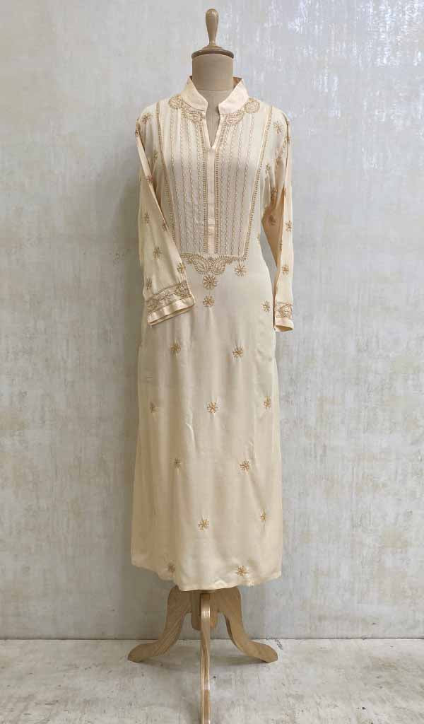 Lucknowi Chikankari kurtas have a charm and elegance that is unique to them. No other form of Indian hand embroidery has that. This delicately embroidered Long Kurti has intricate stitches of chikankari made on a frame by artisans. Usually kurtis like this one takes anywhere between 1 to 2 months to get ready out of which most time is consumed in the hand embroidery and hand printing process. If this is your first Chikankari kurti then be ready to fall in love with this heritage needlecraft and if it’s not your first then probably you’re already in love with the craft. Shop now and embrace the beauty of Nazrana’s heritage needlecraft, redefining sophistication with every product.