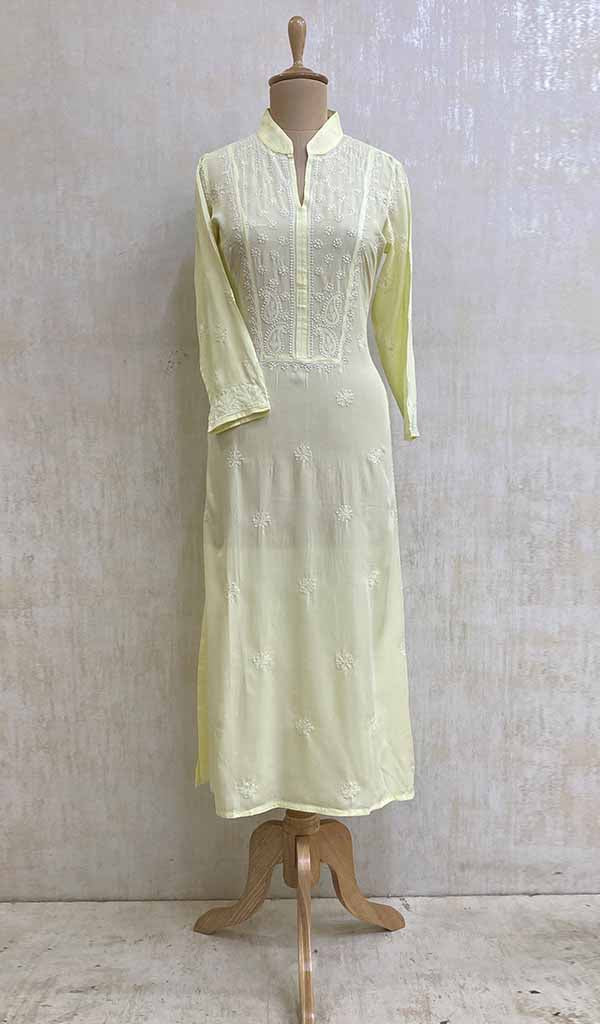 Lucknowi Chikankari kurtas have a charm and elegance that is unique to them. No other form of Indian hand embroidery has that. This delicately embroidered Long Kurti has intricate stitches of chikankari made on a frame by artisans. Usually kurtis like this one takes anywhere between 1 to 2 months to get ready out of which most time is consumed in the hand embroidery and hand printing process. If this is your first Chikankari kurti then be ready to fall in love with this heritage needlecraft and if it’s not your first then probably you’re already in love with the craft. Shop now and embrace the beauty of Nazrana’s heritage needlecraft, redefining sophistication with every product.