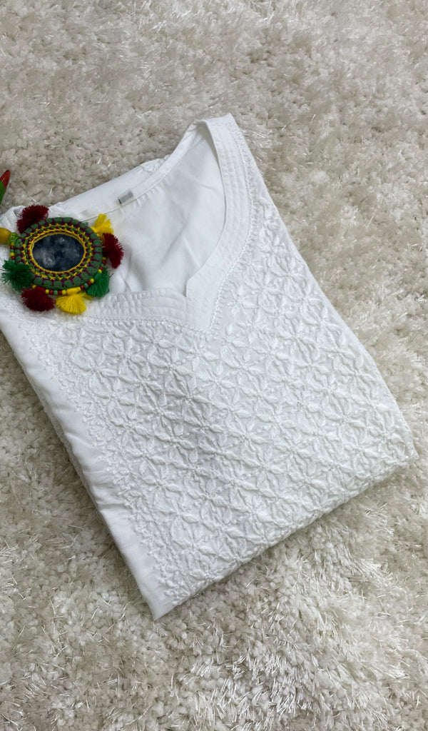 Lucknowi Chikankari kurtas have a charm and elegance that is unique to them. No other form of Indian hand embroidery has that. This delicately embroidered Long Kurti has intricate stitches of chikankari made on a frame by artisans. Usually kurtis like this one takes anywhere between 1 to 2 months to get ready out of which most time is consumed in the hand embroidery and hand printing process. If this is your first Chikankari kurti then be ready to fall in love with this heritage needlecraft and if it’s not your first then probably you’re already in love with the craft. Shop now and embrace the beauty of Nazrana’s heritage needlecraft, redefining sophistication with every product.