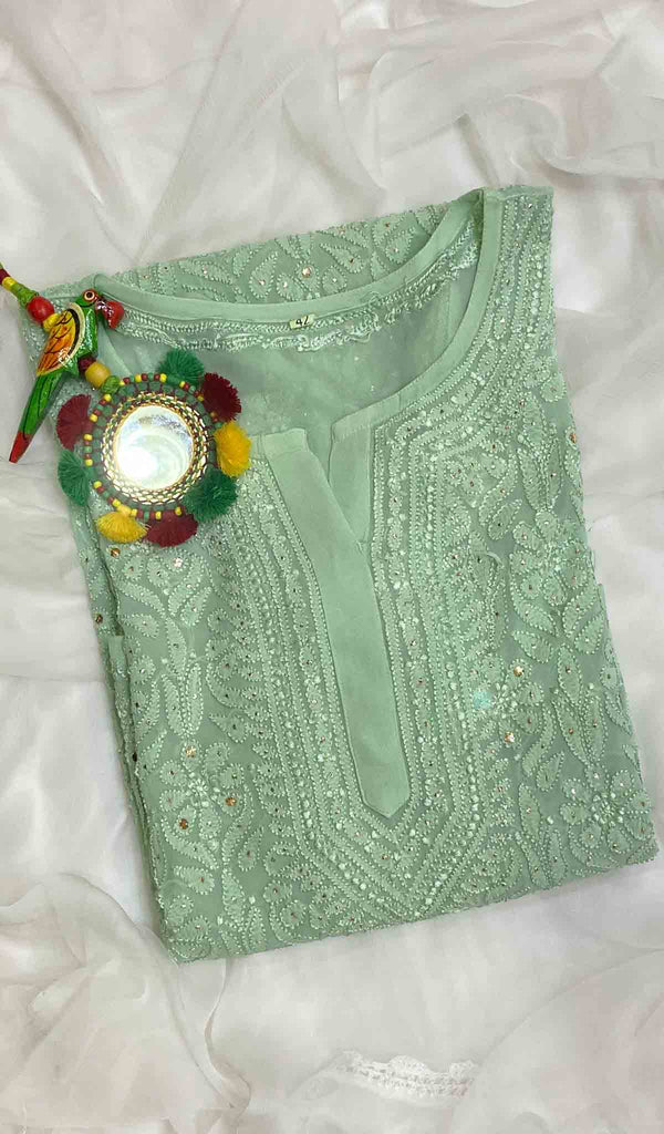 Lucknowi Chikankari kurtas have a charm and elegance that is unique to them. No other form of Indian hand embroidery has that. This delicately embroidered Long Kurti has intricate stitches of chikankari made on a frame by artisans. Usually kurtis like this one takes anywhere between 1 to 2 months to get ready out of which most time is consumed in the hand embroidery and hand printing process. If this is your first Chikankari kurti then be ready to fall in love with this heritage needlecraft and if it’s not your first then probably you’re already in love with the craft. Shop now and embrace the beauty of Nazrana’s heritage needlecraft, redefining sophistication with every product.