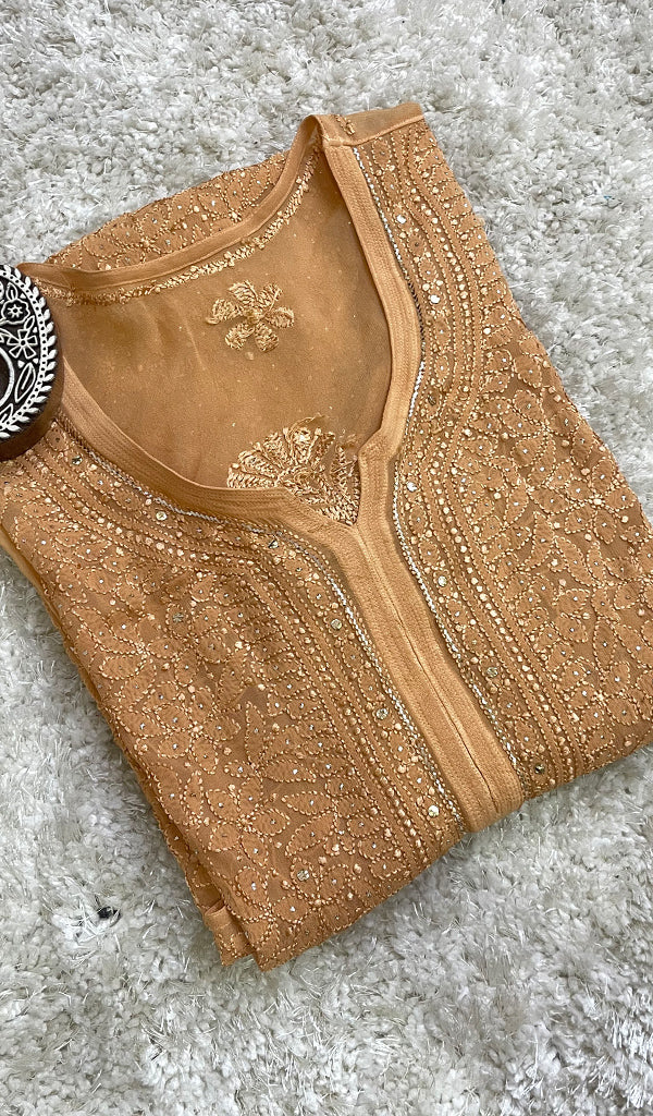 Lucknowi Chikankari kurtas have a charm and elegance that is unique to them. No other form of Indian hand embroidery has that. This delicately embroidered Long Kurti has intricate stitches of chikankari made on a frame by artisans. Usually kurtis like this one takes anywhere between 1 to 2 months to get ready out of which most time is consumed in the hand embroidery and hand printing process. If this is your first Chikankari kurti then be ready to fall in love with this heritage needlecraft and if it’s not your first then probably you’re already in love with the craft. Shop now and embrace the beauty of Nazrana’s heritage needlecraft, redefining sophistication with every product.