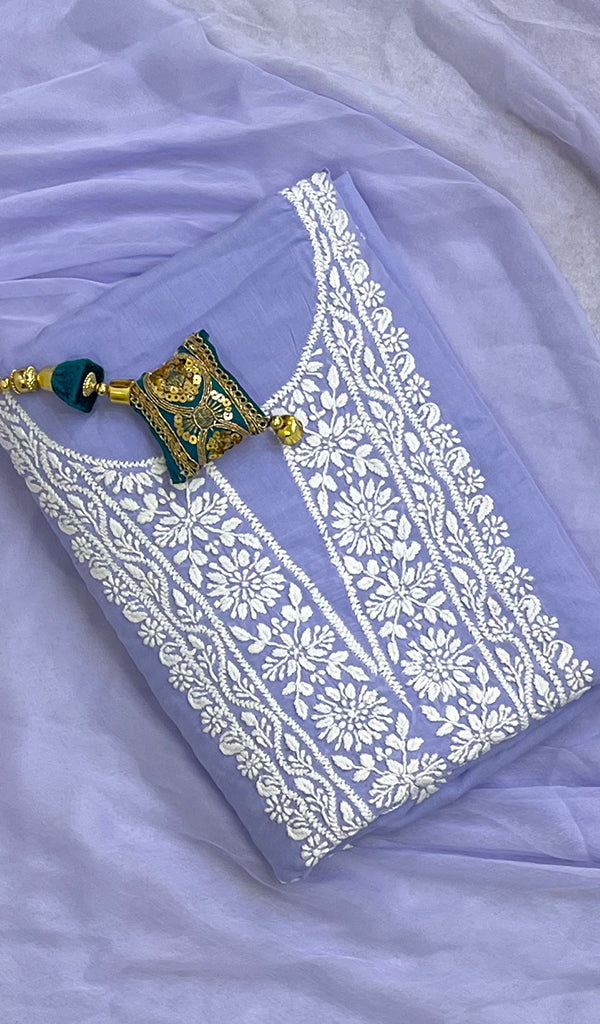 The thing about Lakhnavi Chikankari Suits is that most of them are one of a kind. Once a design is sold out, it’s almost impossible to find a replica or even a similar design anywhere in the market or online. This is what makes Chikankari suit fabrics unique just like this one. It’s made with the finest chikankari stitches by extremely skilled craftsmen of Lucknow. The advantage of buying an unstitched Chikankari suit fabric is that you can get it stitched and customized as per your personal style. Shop now and embrace the beauty of Nazrana’s heritage needlecraft, redefining sophistication with every product