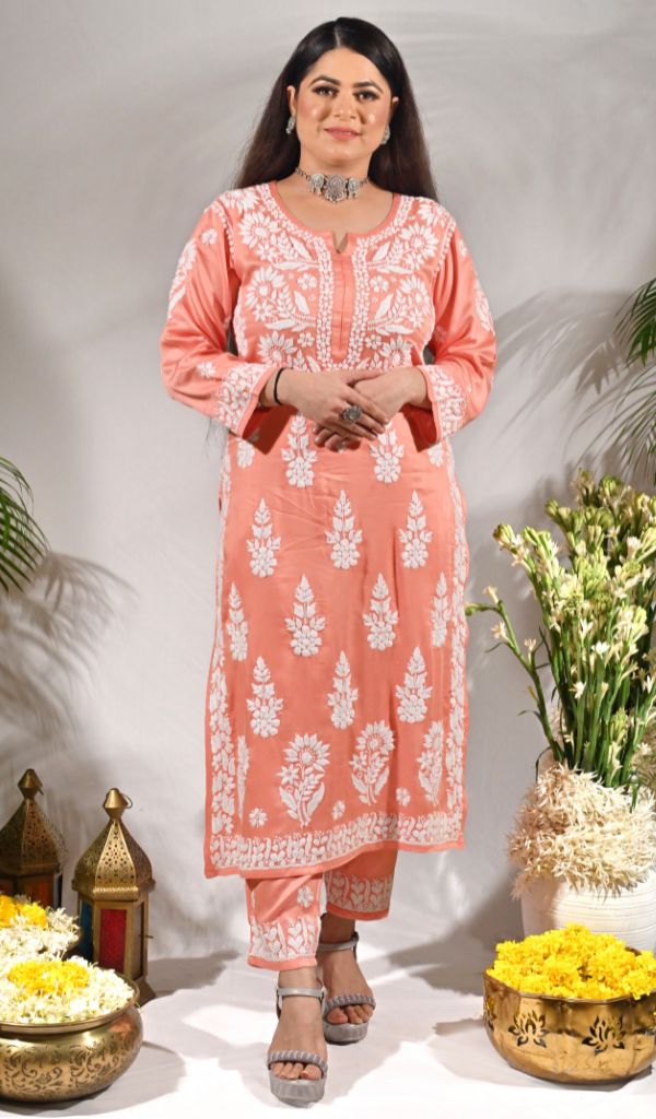 In the recent years stitched sets and Co-ord sets have become very trendy and in-fashion. In Lucknowi Chikankari also stitched sets have taken the center stage as they offer convenience without compromising on the traditional artistry. This stitched set is one such fine example, it has delicate thread work along with meticulous attention to detail. Shop now and embrace the beauty of Nazrana’s heritage needlecraft, redefining sophistication with every product.