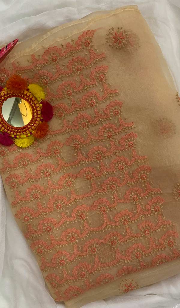 Women's Lucknowi Handcrafted Pure Organza Silk Chikankari Unstitched Kurti Fabric - Honc067935