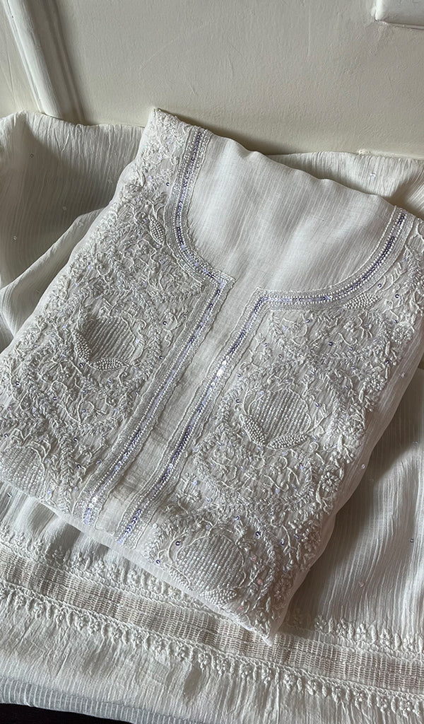 The thing about Lakhnavi Chikankari Suits is that most of them are one of a kind. Once a design is sold out, it’s almost impossible to find a replica or even a similar design anywhere in the market or online. This is what makes Chikankari suit fabrics unique just like this one. It’s made with the finest chikankari stitches by extremely skilled craftsmen of Lucknow. The advantage of buying an unstitched Chikankari suit fabric is that you can get it stitched and customized as per your personal style. Shop now and embrace the beauty of Nazrana’s heritage needlecraft, redefining sophistication with every product