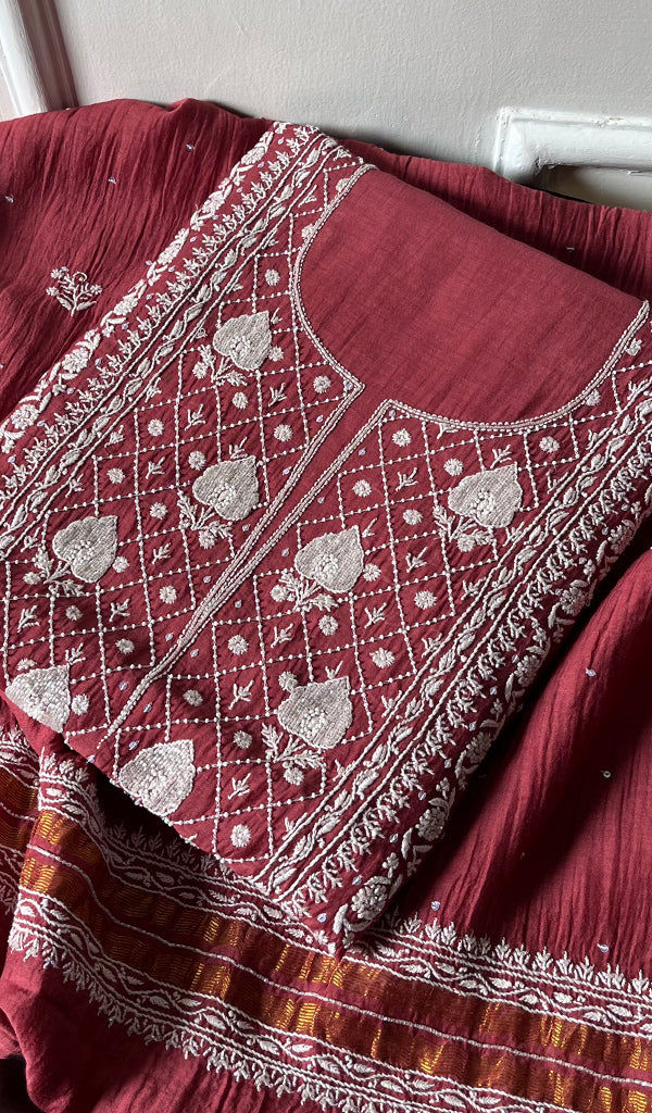 The thing about Lakhnavi Chikankari Suits is that most of them are one of a kind. Once a design is sold out, it’s almost impossible to find a replica or even a similar design anywhere in the market or online. This is what makes Chikankari suit fabrics unique just like this one. It’s made with the finest chikankari stitches by extremely skilled craftsmen of Lucknow. The advantage of buying an unstitched Chikankari suit fabric is that you can get it stitched and customized as per your personal style. Shop now and embrace the beauty of Nazrana’s heritage needlecraft, redefining sophistication with every product.