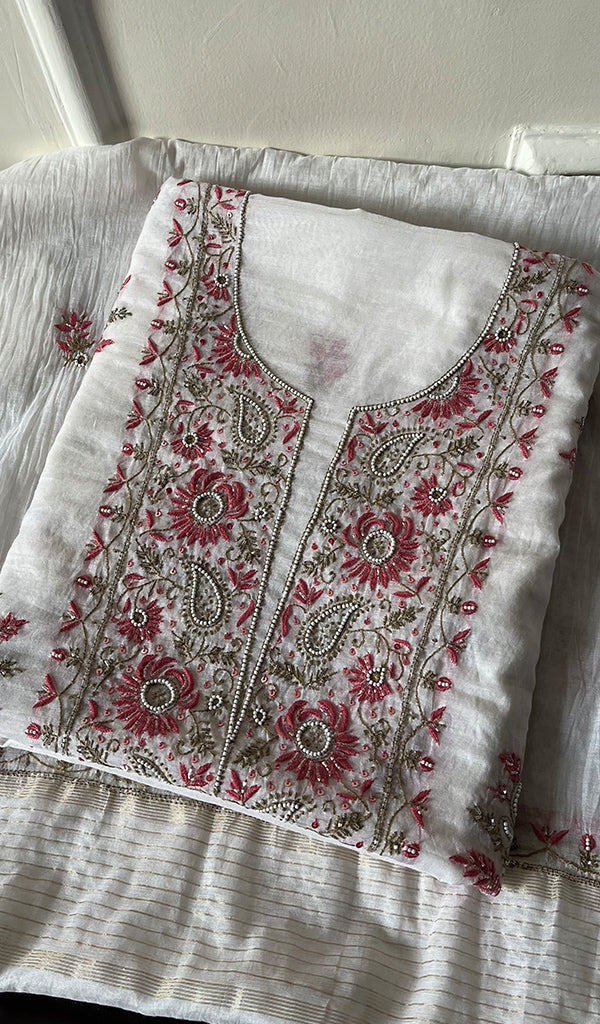 The thing about Lakhnavi Chikankari Suits is that most of them are one of a kind. Once a design is sold out, it’s almost impossible to find a replica or even a similar design anywhere in the market or online. This is what makes Chikankari suit fabrics unique just like this one. It’s made with the finest chikankari stitches by extremely skilled craftsmen of Lucknow. The advantage of buying an unstitched Chikankari suit fabric is that you can get it stitched and customized as per your personal style. Shop now and embrace the beauty of Nazrana’s heritage needlecraft, redefining sophistication with every product.