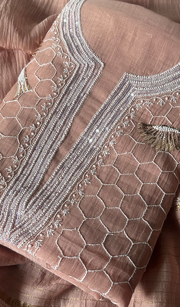 The thing about Lakhnavi Chikankari Suits is that most of them are one of a kind. Once a design is sold out, it’s almost impossible to find a replica or even a similar design anywhere in the market or online. This is what makes Chikankari suit fabrics unique just like this one. It’s made with the finest chikankari stitches by extremely skilled craftsmen of Lucknow. The advantage of buying an unstitched Chikankari suit fabric is that you can get it stitched and customized as per your personal style. Shop now and embrace the beauty of Nazrana’s heritage needlecraft, redefining sophistication with every product.