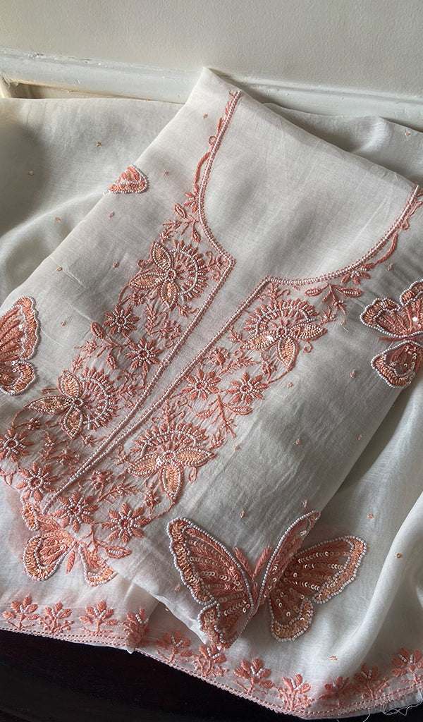 The thing about Lakhnavi Chikankari Suits is that most of them are one of a kind. Once a design is sold out, it’s almost impossible to find a replica or even a similar design anywhere in the market or online. This is what makes Chikankari suit fabrics unique just like this one. It’s made with the finest chikankari stitches by extremely skilled craftsmen of Lucknow. The advantage of buying an unstitched Chikankari suit fabric is that you can get it stitched and customized as per your personal style. Shop now and embrace the beauty of Nazrana’s heritage needlecraft, redefining sophistication with every product