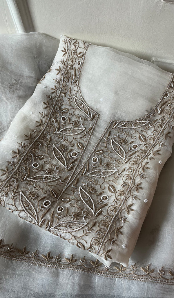 The thing about Lakhnavi Chikankari Suits is that most of them are one of a kind. Once a design is sold out, it’s almost impossible to find a replica or even a similar design anywhere in the market or online. This is what makes Chikankari suit fabrics unique just like this one. It’s made with the finest chikankari stitches by extremely skilled craftsmen of Lucknow. The advantage of buying an unstitched Chikankari suit fabric is that you can get it stitched and customized as per your personal style. Shop now and embrace the beauty of Nazrana’s heritage needlecraft, redefining sophistication with every product.