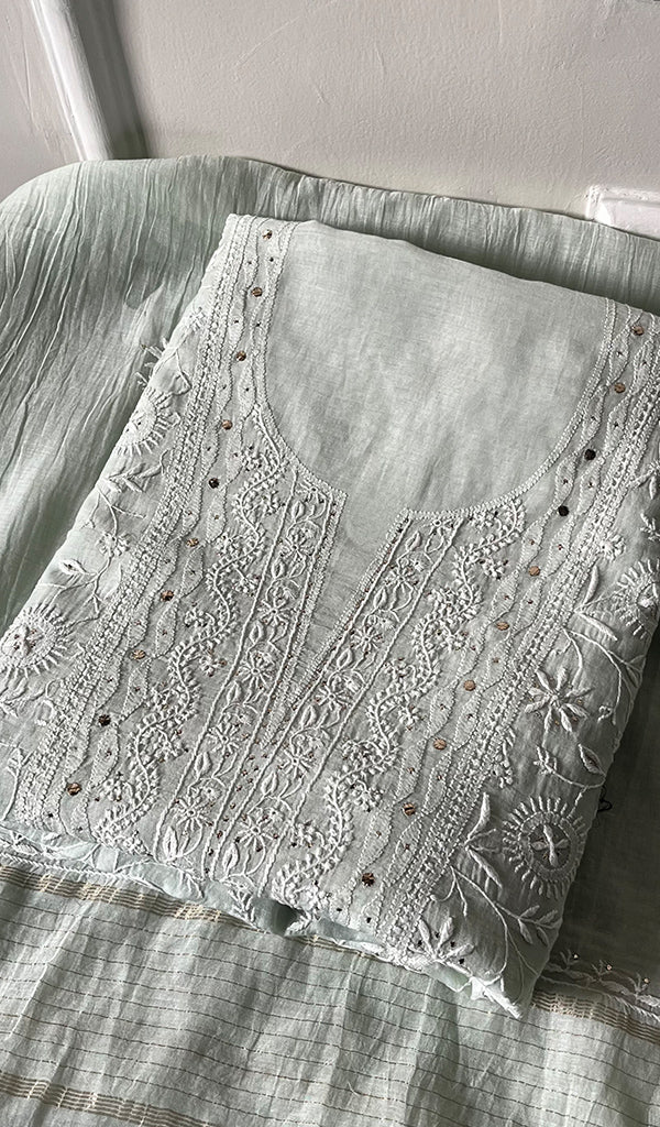 The thing about Lakhnavi Chikankari Suits is that most of them are one of a kind. Once a design is sold out, it’s almost impossible to find a replica or even a similar design anywhere in the market or online. This is what makes Chikankari suit fabrics unique just like this one. It’s made with the finest chikankari stitches by extremely skilled craftsmen of Lucknow. The advantage of buying an unstitched Chikankari suit fabric is that you can get it stitched and customized as per your personal style. Shop now and embrace the beauty of Nazrana’s heritage needlecraft, redefining sophistication with every product.