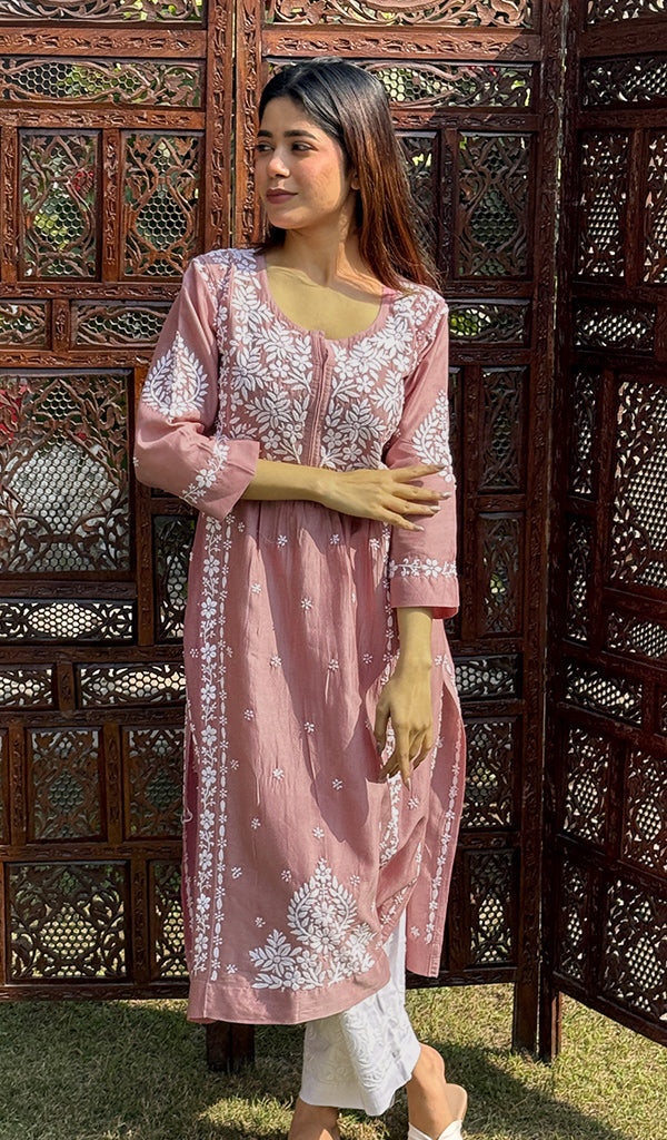 Lucknowi Chikankari kurtas have a charm and elegance that is unique to them. No other form of Indian hand embroidery has that. This delicately embroidered Long Kurti has intricate stitches of chikankari made on a frame by artisans. Usually kurtis like this one takes anywhere between 1 to 2 months to get ready out of which most time is consumed in the hand embroidery and hand printing process. If this is your first Chikankari kurti then be ready to fall in love with this heritage needlecraft and if it’s not your first then probably you’re already in love with the craft. Shop now and embrace the beauty of Nazrana’s heritage needlecraft, redefining sophistication with every product.