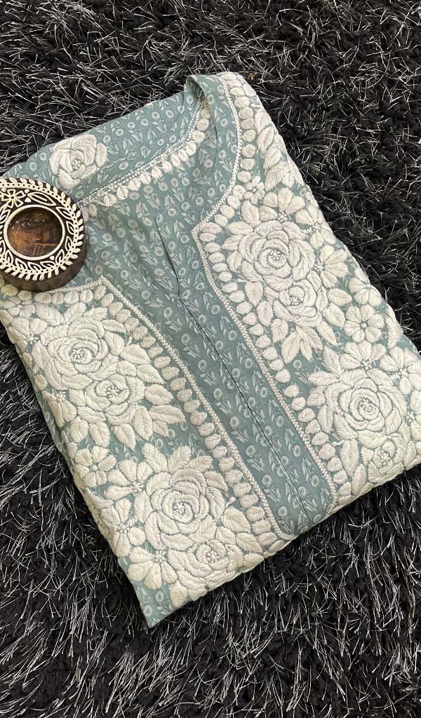 Lucknowi Chikankari kurtas have a charm and elegance that is unique to them. No other form of Indian hand embroidery has that. This delicately embroidered Long Kurti has intricate stitches of chikankari made on a frame by artisans. Usually kurtis like this one takes anywhere between 1 to 2 months to get ready out of which most time is consumed in the hand embroidery and hand printing process. If this is your first Chikankari kurti then be ready to fall in love with this heritage needlecraft and if it’s not your first then probably you’re already in love with the craft. Shop now and embrace the beauty of Nazrana’s heritage needlecraft, redefining sophistication with every product.