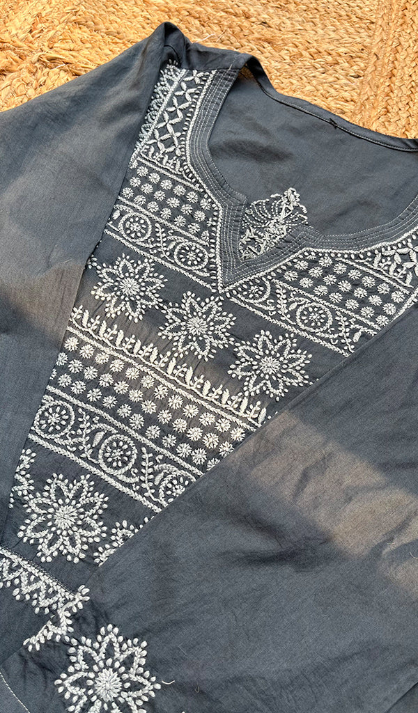 Lucknowi Chikankari kurtas have a charm and elegance that is unique to them. No other form of Indian hand embroidery has that. This delicately embroidered Long Kurti has intricate stitches of chikankari made on a frame by artisans. Usually kurtis like this one takes anywhere between 1 to 2 months to get ready out of which most time is consumed in the hand embroidery and hand printing process. If this is your first Chikankari kurti then be ready to fall in love with this heritage needlecraft and if it’s not your first then probably you’re already in love with the craft. Shop now and embrace the beauty of Nazrana’s heritage needlecraft, redefining sophistication with every product.