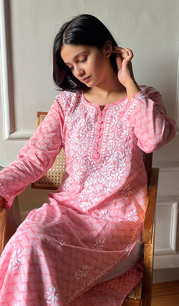 Lucknowi Chikankari kurtas have a charm and elegance that is unique to them. No other form of Indian hand embroidery has that. This delicately embroidered Long Kurti has intricate stitches of chikankari made on a frame by artisans. Usually kurtis like this one takes anywhere between 1 to 2 months to get ready out of which most time is consumed in the hand embroidery and hand printing process. If this is your first Chikankari kurti then be ready to fall in love with this heritage needlecraft and if it’s not your first then probably you’re already in love with the craft. Shop now and embrace the beauty of Nazrana’s heritage needlecraft, redefining sophistication with every product.