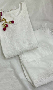 A: A chikan kurta set typically includes a long hand-embroidered kurta and a matching bottom. Nazrana Chikan offers these in a range of colors and sizes for women.