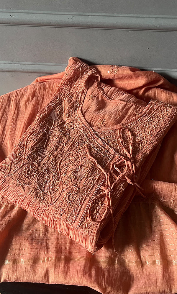 The thing about Lakhnavi Chikankari Suits is that most of them are one of a kind. Once a design is sold out, it’s almost impossible to find a replica or even a similar design anywhere in the market or online. This is what makes Chikankari suit fabrics unique just like this one. It’s made with the finest chikankari stitches by extremely skilled craftsmen of Lucknow. The advantage of buying an unstitched Chikankari suit fabric is that you can get it stitched and customized as per your personal style. Shop now and embrace the beauty of Nazrana’s heritage needlecraft, redefining sophistication with every product.