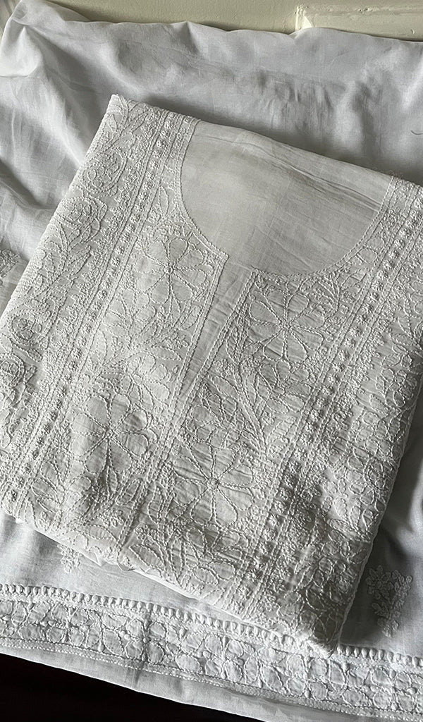 The thing about Lakhnavi Chikankari Suits is that most of them are one of a kind. Once a design is sold out, it’s almost impossible to find a replica or even a similar design anywhere in the market or online. This is what makes Chikankari suit fabrics unique just like this one. It’s made with the finest chikankari stitches by extremely skilled craftsmen of Lucknow. The advantage of buying an unstitched Chikankari suit fabric is that you can get it stitched and customized as per your personal style. Shop now and embrace the beauty of Nazrana’s heritage needlecraft, redefining sophistication with every product