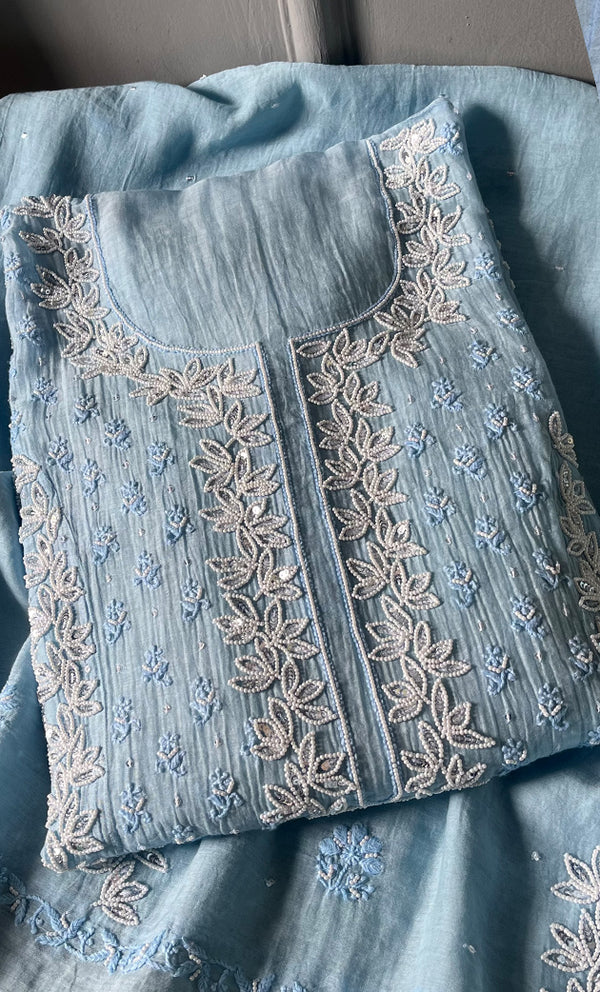The thing about Lakhnavi Chikankari Suits is that most of them are one of a kind. Once a design is sold out, it’s almost impossible to find a replica or even a similar design anywhere in the market or online. This is what makes Chikankari suit fabrics unique just like this one. It’s made with the finest chikankari stitches by extremely skilled craftsmen of Lucknow. The advantage of buying an unstitched Chikankari suit fabric is that you can get it stitched and customized as per your personal style. Shop now and embrace the beauty of Nazrana’s heritage needlecraft, redefining sophistication with every product.