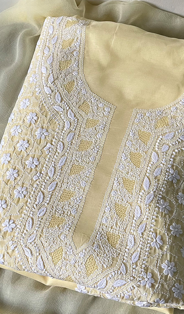 The thing about Lakhnavi Chikankari Suits is that most of them are one of a kind. Once a design is sold out, it’s almost impossible to find a replica or even a similar design anywhere in the market or online. This is what makes Chikankari suit fabrics unique just like this one. It’s made with the finest chikankari stitches by extremely skilled craftsmen of Lucknow. The advantage of buying an unstitched Chikankari suit fabric is that you can get it stitched and customized as per your personal style. Shop now and embrace the beauty of Nazrana’s heritage needlecraft, redefining sophistication with every product.