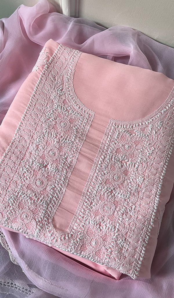 The thing about Lakhnavi Chikankari Suits is that most of them are one of a kind. Once a design is sold out, it’s almost impossible to find a replica or even a similar design anywhere in the market or online. This is what makes Chikankari suit fabrics unique just like this one. It’s made with the finest chikankari stitches by extremely skilled craftsmen of Lucknow. The advantage of buying an unstitched Chikankari suit fabric is that you can get it stitched and customized as per your personal style. Shop now and embrace the beauty of Nazrana’s heritage needlecraft, redefining sophistication with every product.