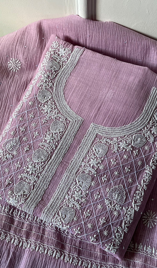 The thing about Lakhnavi Chikankari Suits is that most of them are one of a kind. Once a design is sold out, it’s almost impossible to find a replica or even a similar design anywhere in the market or online. This is what makes Chikankari suit fabrics unique just like this one. It’s made with the finest chikankari stitches by extremely skilled craftsmen of Lucknow. The advantage of buying an unstitched Chikankari suit fabric is that you can get it stitched and customized as per your personal style. Shop now and embrace the beauty of Nazrana’s heritage needlecraft, redefining sophistication with every product
