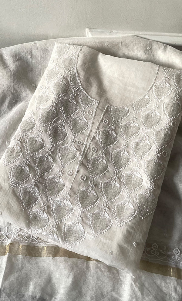 The thing about Lakhnavi Chikankari Suits is that most of them are one of a kind. Once a design is sold out, it’s almost impossible to find a replica or even a similar design anywhere in the market or online. This is what makes Chikankari suit fabrics unique just like this one. It’s made with the finest chikankari stitches by extremely skilled craftsmen of Lucknow. The advantage of buying an unstitched Chikankari suit fabric is that you can get it stitched and customized as per your personal style. Shop now and embrace the beauty of Nazrana’s heritage needlecraft, redefining sophistication with every product