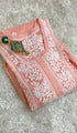 Lucknowi Chikankari kurtas have a charm and elegance that is unique to them. No other form of Indian hand embroidery has that. This delicately embroidered Long Kurti has intricate stitches of chikankari made on a frame by artisans. Usually kurtis like this one takes anywhere between 1 to 2 months to get ready out of which most time is consumed in the hand embroidery and hand printing process. If this is your first Chikankari kurti then be ready to fall in love with this heritage needlecraft and if it’s not your first then probably you’re already in love with the craft. Shop now and embrace the beauty of Nazrana’s heritage needlecraft, redefining sophistication with every product.