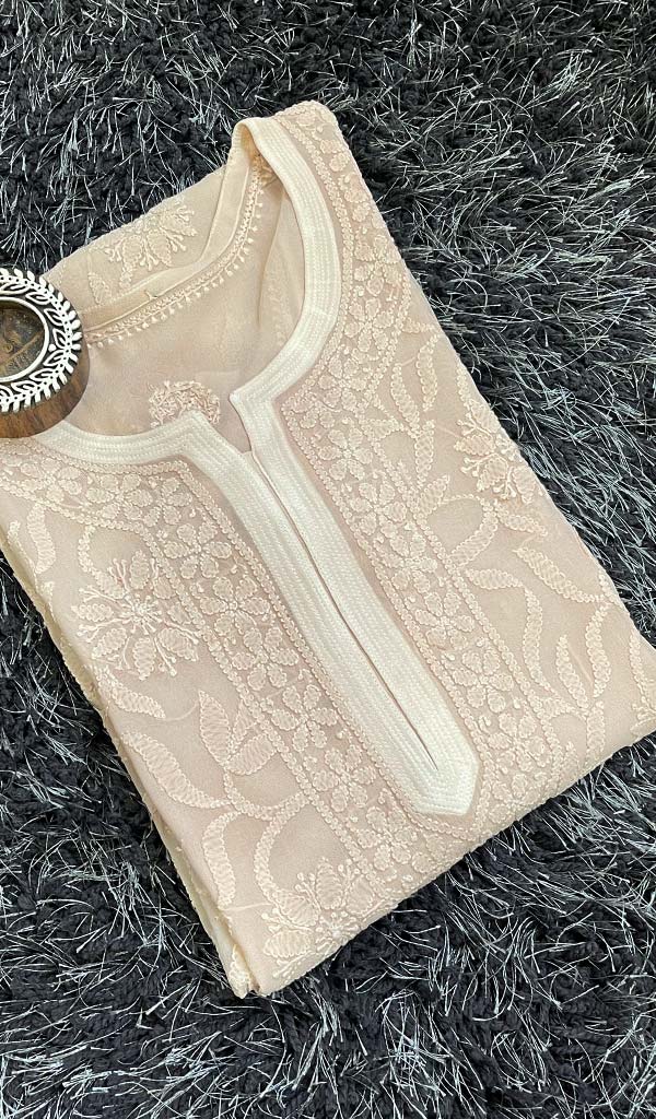 Lucknowi Chikankari kurtas have a charm and elegance that is unique to them. No other form of Indian hand embroidery has that. This delicately embroidered Long Kurti has intricate stitches of chikankari made on a frame by artisans. Usually kurtis like this one takes anywhere between 1 to 2 months to get ready out of which most time is consumed in the hand embroidery and hand printing process. If this is your first Chikankari kurti then be ready to fall in love with this heritage needlecraft and if it’s not your first then probably you’re already in love with the craft. Shop now and embrace the beauty of Nazrana’s heritage needlecraft, redefining sophistication with every product.