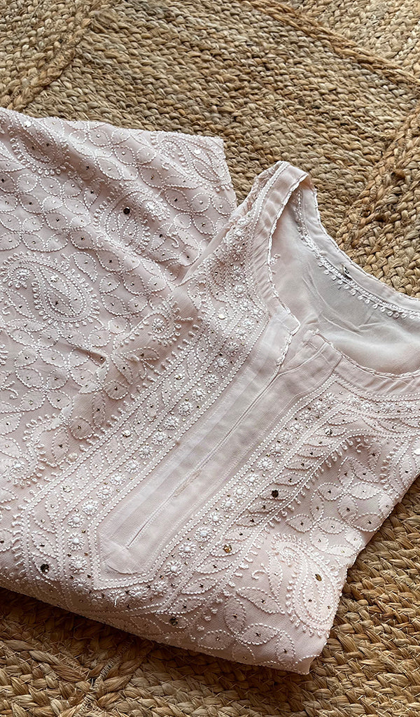 Lucknowi Chikankari kurtas have a charm and elegance that is unique to them. No other form of Indian hand embroidery has that. This delicately embroidered Long Kurti has intricate stitches of chikankari made on a frame by artisans. Usually kurtis like this one takes anywhere between 1 to 2 months to get ready out of which most time is consumed in the hand embroidery and hand printing process. If this is your first Chikankari kurti then be ready to fall in love with this heritage needlecraft and if it’s not your first then probably you’re already in love with the craft. Shop now and embrace the beauty of Nazrana’s heritage needlecraft, redefining sophistication with every product.