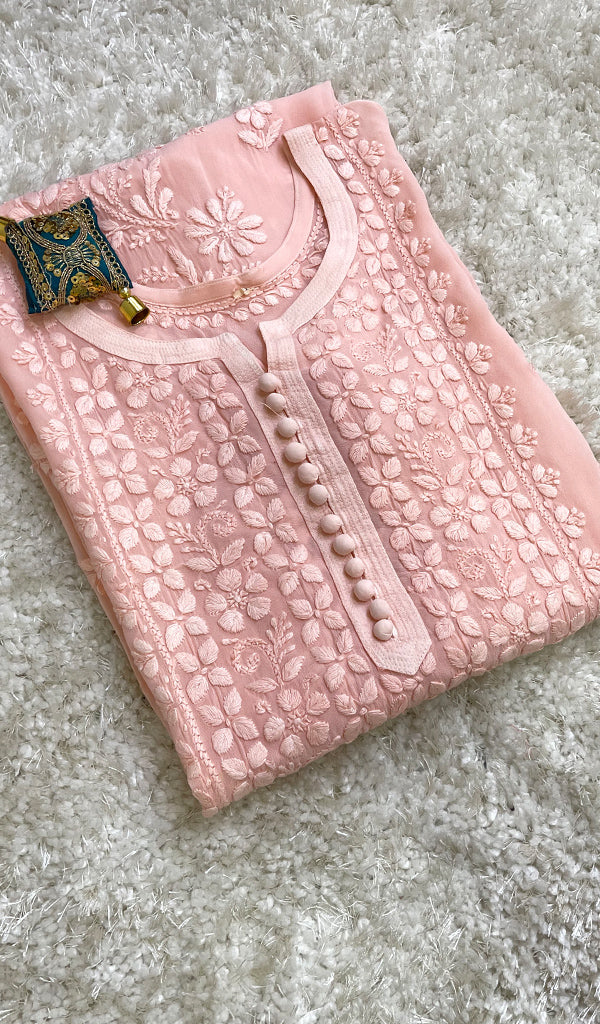 Lucknowi Chikankari kurtas have a charm and elegance that is unique to them. No other form of Indian hand embroidery has that. This delicately embroidered Long Kurti has intricate stitches of chikankari made on a frame by artisans. Usually kurtis like this one takes anywhere between 1 to 2 months to get ready out of which most time is consumed in the hand embroidery and hand printing process. If this is your first Chikankari kurti then be ready to fall in love with this heritage needlecraft and if it’s not your first then probably you’re already in love with the craft. Shop now and embrace the beauty of Nazrana’s heritage needlecraft, redefining sophistication with every product.