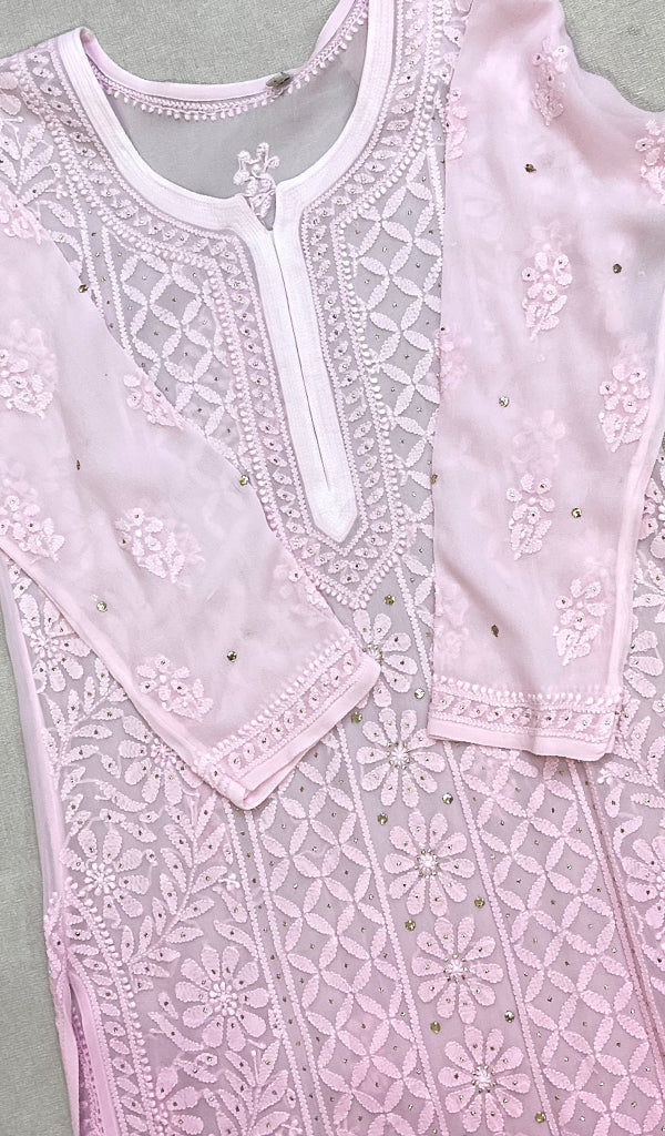 Lucknowi Chikankari kurtas have a charm and elegance that is unique to them. No other form of Indian hand embroidery has that. This delicately embroidered Long Kurti has intricate stitches of chikankari made on a frame by artisans. Usually kurtis like this one takes anywhere between 1 to 2 months to get ready out of which most time is consumed in the hand embroidery and hand printing process. If this is your first Chikankari kurti then be ready to fall in love with this heritage needlecraft and if it’s not your first then probably you’re already in love with the craft. Shop now and embrace the beauty of Nazrana’s heritage needlecraft, redefining sophistication with every product.