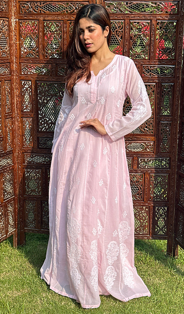 Lucknowi Chikankari kurtas have a charm and elegance that is unique to them. No other form of Indian hand embroidery has that. This delicately embroidered Long Kurti has intricate stitches of chikankari made on a frame by artisans. Usually kurtis like this one takes anywhere between 1 to 2 months to get ready out of which most time is consumed in the hand embroidery and hand printing process. If this is your first Chikankari kurti then be ready to fall in love with this heritage needlecraft and if it’s not your first then probably you’re already in love with the craft. Shop now and embrace the beauty of Nazrana’s heritage needlecraft, redefining sophistication with every product.