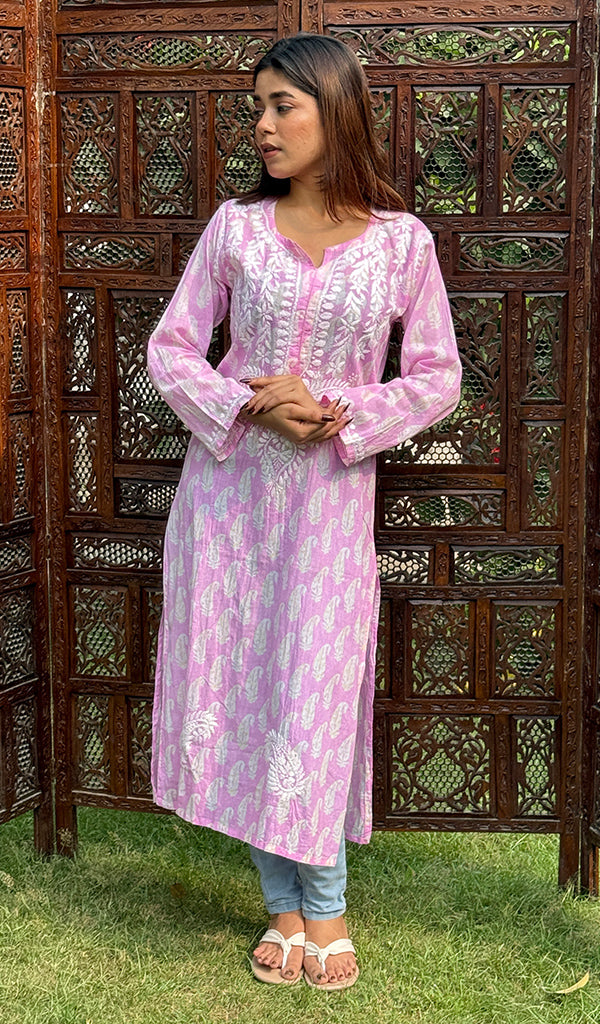 Lucknowi Chikankari kurtas have a charm and elegance that is unique to them. No other form of Indian hand embroidery has that. This delicately embroidered Long Kurti has intricate stitches of chikankari made on a frame by artisans. Usually kurtis like this one takes anywhere between 1 to 2 months to get ready out of which most time is consumed in the hand embroidery and hand printing process. If this is your first Chikankari kurti then be ready to fall in love with this heritage needlecraft and if it’s not your first then probably you’re already in love with the craft. Shop now and embrace the beauty of Nazrana’s heritage needlecraft, redefining sophistication with every product.