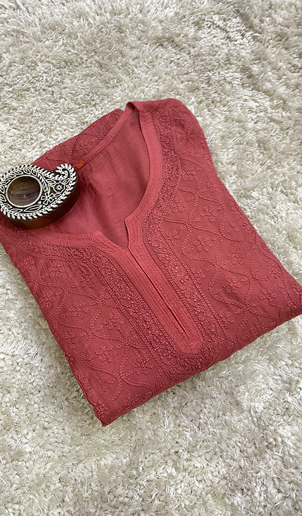 ]Lucknowi Chikankari kurtas have a charm and elegance that is unique to them. No other form of Indian hand embroidery has that. This delicately embroidered Long Kurti has intricate stitches of chikankari made on a frame by artisans. Usually kurtis like this one takes anywhere between 1 to 2 months to get ready out of which most time is consumed in the hand embroidery and hand printing process. If this is your first Chikankari kurti then be ready to fall in love with this heritage needlecraft and if it’s not your first then probably you’re already in love with the craft. Shop now and embrace the beauty of Nazrana’s heritage needlecraft, redefining sophistication with every product.