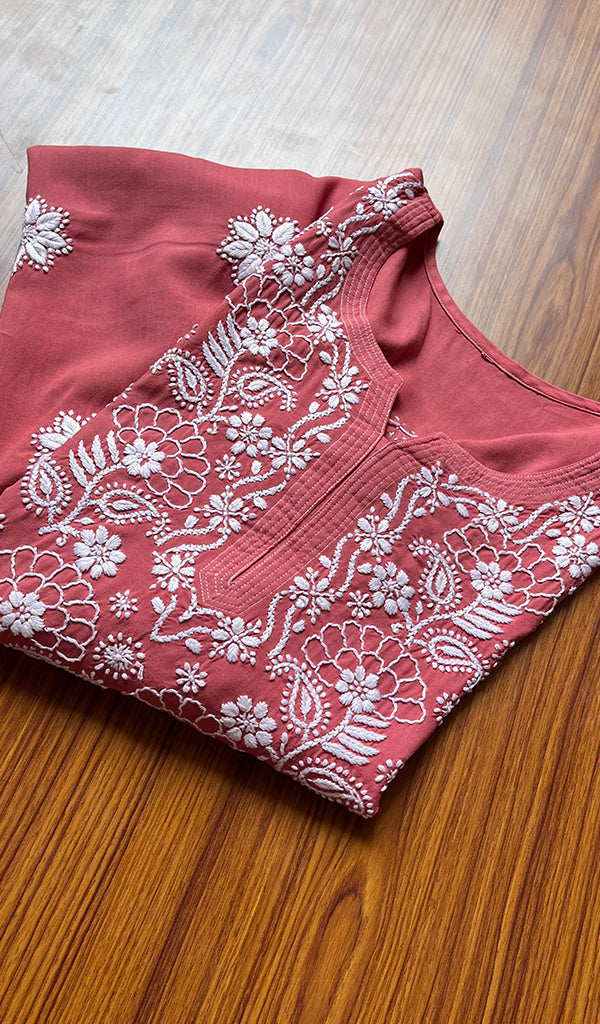 Lucknowi Chikankari kurtas have a charm and elegance that is unique to them. No other form of Indian hand embroidery has that. This delicately embroidered Long Kurti has intricate stitches of chikankari made on a frame by artisans. Usually kurtis like this one takes anywhere between 1 to 2 months to get ready out of which most time is consumed in the hand embroidery and hand printing process. If this is your first Chikankari kurti then be ready to fall in love with this heritage needlecraft and if it’s not your first then probably you’re already in love with the craft. Shop now and embrace the beauty of Nazrana’s heritage needlecraft, redefining sophistication with every product.