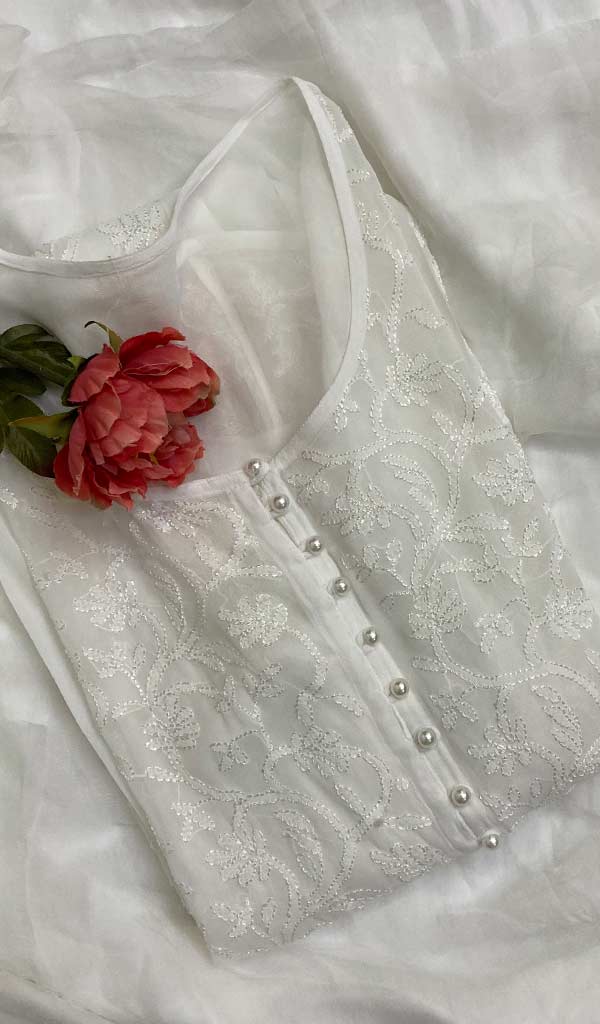 Lucknowi Chikankari kurtas have a charm and elegance that is unique to them. No other form of Indian hand embroidery has that. This delicately embroidered Long Kurti has intricate stitches of chikankari made on a frame by artisans. Usually kurtis like this one takes anywhere between 1 to 2 months to get ready out of which most time is consumed in the hand embroidery and hand printing process. If this is your first Chikankari kurti then be ready to fall in love with this heritage needlecraft and if it’s not your first then probably you’re already in love with the craft. Shop now and embrace the beauty of Nazrana’s heritage needlecraft, redefining sophistication with every product.