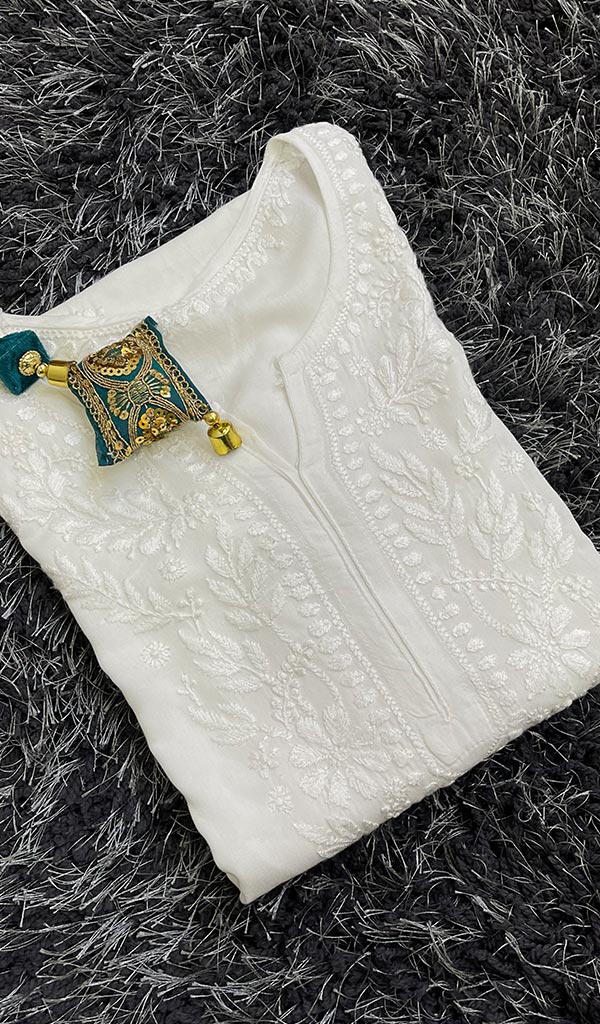勒克瑙手工制作的人造丝 Chikankari Kurti - HONC077804