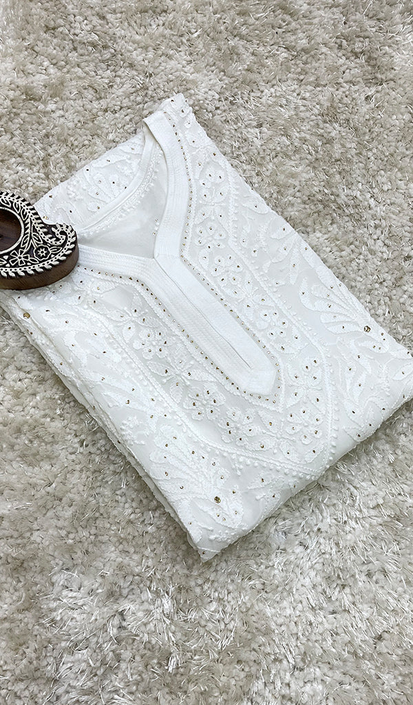 Lucknowi Chikankari kurtas have a charm and elegance that is unique to them. No other form of Indian hand embroidery has that. This delicately embroidered Long Kurti has intricate stitches of chikankari made on a frame by artisans. Usually kurtis like this one takes anywhere between 1 to 2 months to get ready out of which most time is consumed in the hand embroidery and hand printing process. If this is your first Chikankari kurti then be ready to fall in love with this heritage needlecraft and if it’s not your first then probably you’re already in love with the craft. Shop now and embrace the beauty of Nazrana’s heritage needlecraft, redefining sophistication with every product.