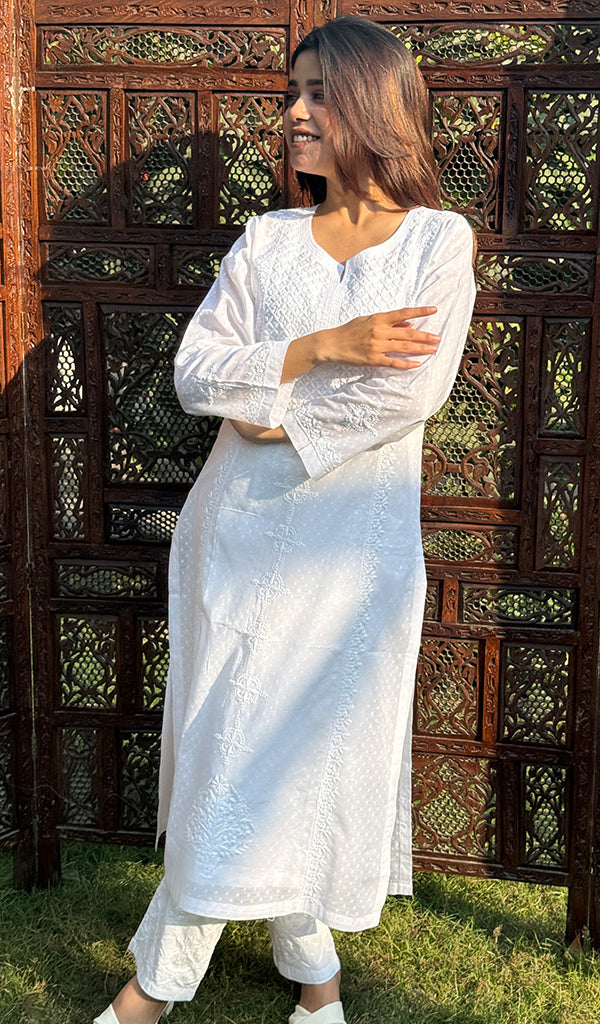 Lucknowi Chikankari kurtas have a charm and elegance that is unique to them. No other form of Indian hand embroidery has that. This delicately embroidered Long Kurti has intricate stitches of chikankari made on a frame by artisans. Usually kurtis like this one takes anywhere between 1 to 2 months to get ready out of which most time is consumed in the hand embroidery and hand printing process. If this is your first Chikankari kurti then be ready to fall in love with this heritage needlecraft and if it’s not your first then probably you’re already in love with the craft. Shop now and embrace the beauty of Nazrana’s heritage needlecraft, redefining sophistication with every product.