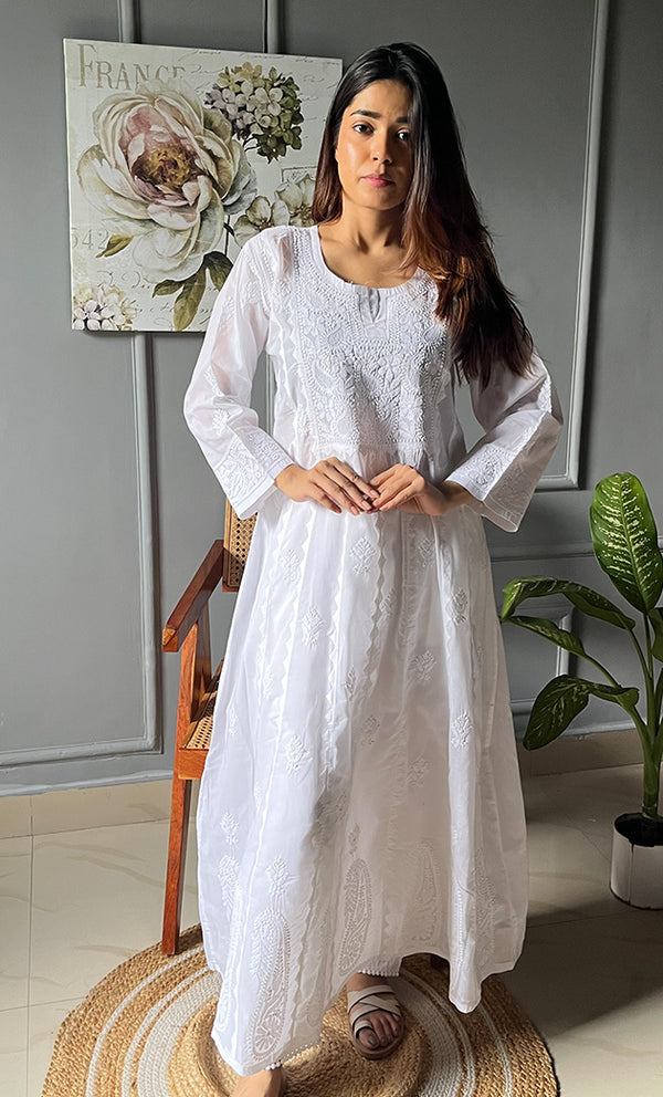 Lucknowi Chikankari kurtas have a charm and elegance that is unique to them. No other form of Indian hand embroidery has that. This delicately embroidered Long Kurti has intricate stitches of chikankari made on a frame by artisans. Usually kurtis like this one takes anywhere between 1 to 2 months to get ready out of which most time is consumed in the hand embroidery and hand printing process. If this is your first Chikankari kurti then be ready to fall in love with this heritage needlecraft and if it’s not your first then probably you’re already in love with the craft. Shop now and embrace the beauty of Nazrana’s heritage needlecraft, redefining sophistication with every product.