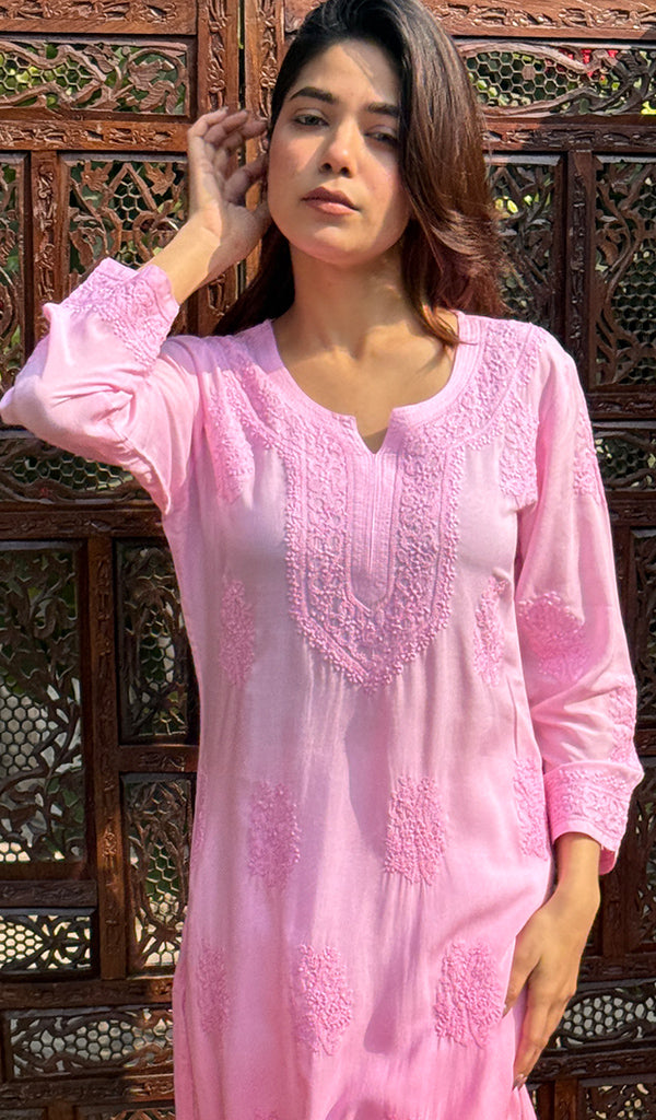 Lucknowi Chikankari kurtas have a charm and elegance that is unique to them. No other form of Indian hand embroidery has that. This delicately embroidered Long Kurti has intricate stitches of chikankari made on a frame by artisans. Usually kurtis like this one takes anywhere between 1 to 2 months to get ready out of which most time is consumed in the hand embroidery and hand printing process. If this is your first Chikankari kurti then be ready to fall in love with this heritage needlecraft and if it’s not your first then probably you’re already in love with the craft. Shop now and embrace the beauty of Nazrana’s heritage needlecraft, redefining sophistication with every product.
