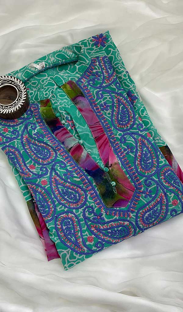 Lucknowi Chikankari kurtas have a charm and elegance that is unique to them. No other form of Indian hand embroidery has that. This delicately embroidered Long Kurti has intricate stitches of chikankari made on a frame by artisans. Usually kurtis like this one takes anywhere between 1 to 2 months to get ready out of which most time is consumed in the hand embroidery and hand printing process. If this is your first Chikankari kurti then be ready to fall in love with this heritage needlecraft and if it’s not your first then probably you’re already in love with the craft. Shop now and embrace the beauty of Nazrana’s heritage needlecraft, redefining sophistication with every product.