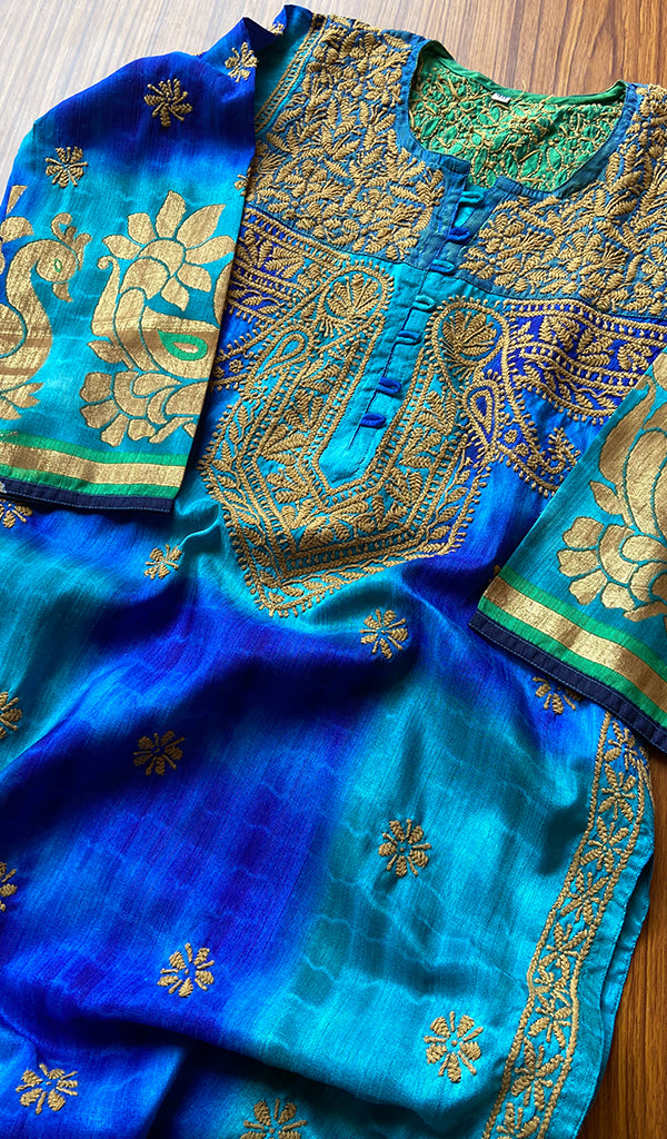 Lucknowi Chikankari kurtas have a charm and elegance that is unique to them. No other form of Indian hand embroidery has that. This delicately embroidered Long Kurti has intricate stitches of chikankari made on a frame by artisans. Usually kurtis like this one takes anywhere between 1 to 2 months to get ready out of which most time is consumed in the hand embroidery and hand printing process. If this is your first Chikankari kurti then be ready to fall in love with this heritage needlecraft and if it’s not your first then probably you’re already in love with the craft. Shop now and embrace the beauty of Nazrana’s heritage needlecraft, redefining sophistication with every product.