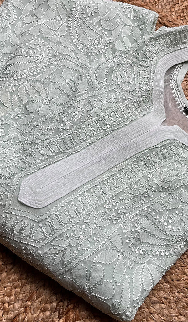 Lucknowi Chikankari kurtas have a charm and elegance that is unique to them. No other form of Indian hand embroidery has that. This delicately embroidered Long Kurti has intricate stitches of chikankari made on a frame by artisans. Usually kurtis like this one takes anywhere between 1 to 2 months to get ready out of which most time is consumed in the hand embroidery and hand printing process. If this is your first Chikankari kurti then be ready to fall in love with this heritage needlecraft and if it’s not your first then probably you’re already in love with the craft. Shop now and embrace the beauty of Nazrana’s heritage needlecraft, redefining sophistication with every product.