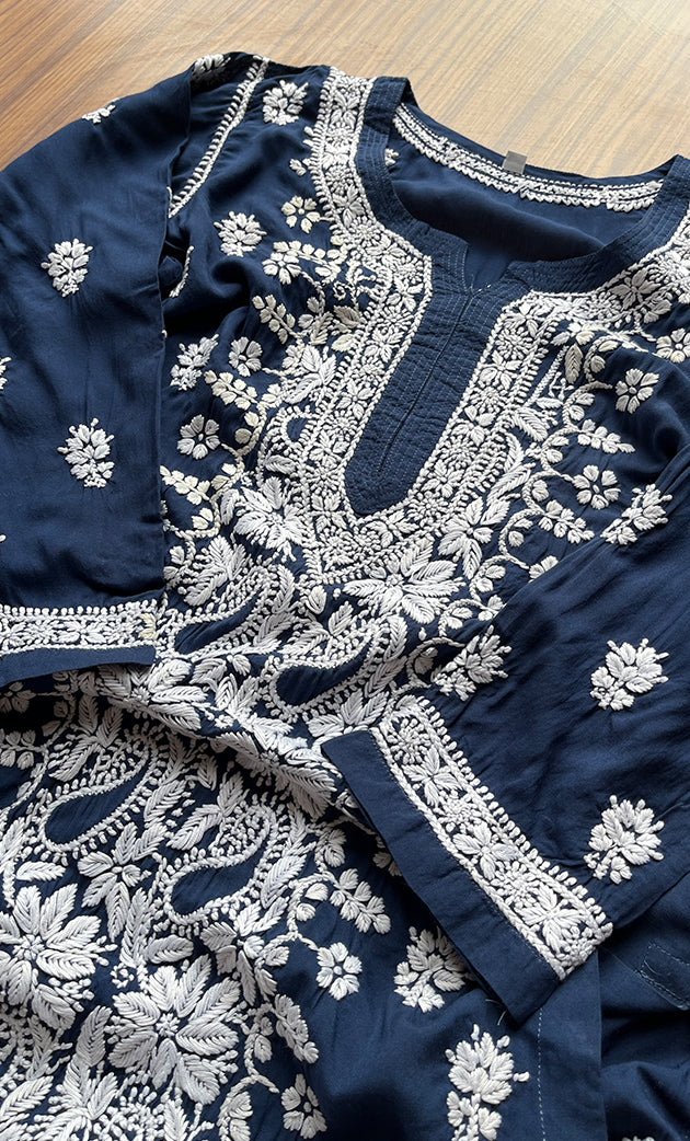 Lucknowi Chikankari kurtas have a charm and elegance that is unique to them. No other form of Indian hand embroidery has that. This delicately embroidered Long Kurti has intricate stitches of chikankari made on a frame by artisans. Usually kurtis like this one takes anywhere between 1 to 2 months to get ready out of which most time is consumed in the hand embroidery and hand printing process. If this is your first Chikankari kurti then be ready to fall in love with this heritage needlecraft and if it’s not your first then probably you’re already in love with the craft. Shop now and embrace the beauty of Nazrana’s heritage needlecraft, redefining sophistication with every product.
