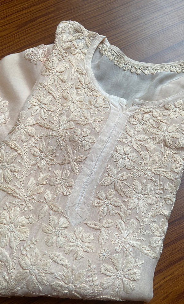 Lucknowi Chikankari kurtas have a charm and elegance that is unique to them. No other form of Indian hand embroidery has that. This delicately embroidered Long Kurti has intricate stitches of chikankari made on a frame by artisans. Usually kurtis like this one takes anywhere between 1 to 2 months to get ready out of which most time is consumed in the hand embroidery and hand printing process. If this is your first Chikankari kurti then be ready to fall in love with this heritage needlecraft and if it’s not your first then probably you’re already in love with the craft. Shop now and embrace the beauty of Nazrana’s heritage needlecraft, redefining sophistication with every product.