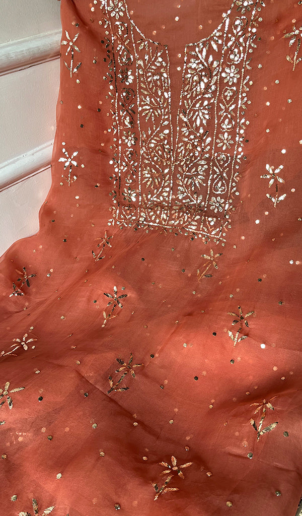 The thing about Lakhnavi Chikankari Suits is that most of them are one of a kind. Once a design is sold out, it’s almost impossible to find a replica or even a similar design anywhere in the market or online. This is what makes Chikankari suit fabrics unique just like this one. It’s made with the finest chikankari stitches by extremely skilled craftsmen of Lucknow. The advantage of buying an unstitched Chikankari suit fabric is that you can get it stitched and customized as per your personal style. Shop now and embrace the beauty of Nazrana’s heritage needlecraft, redefining sophistication with every product.