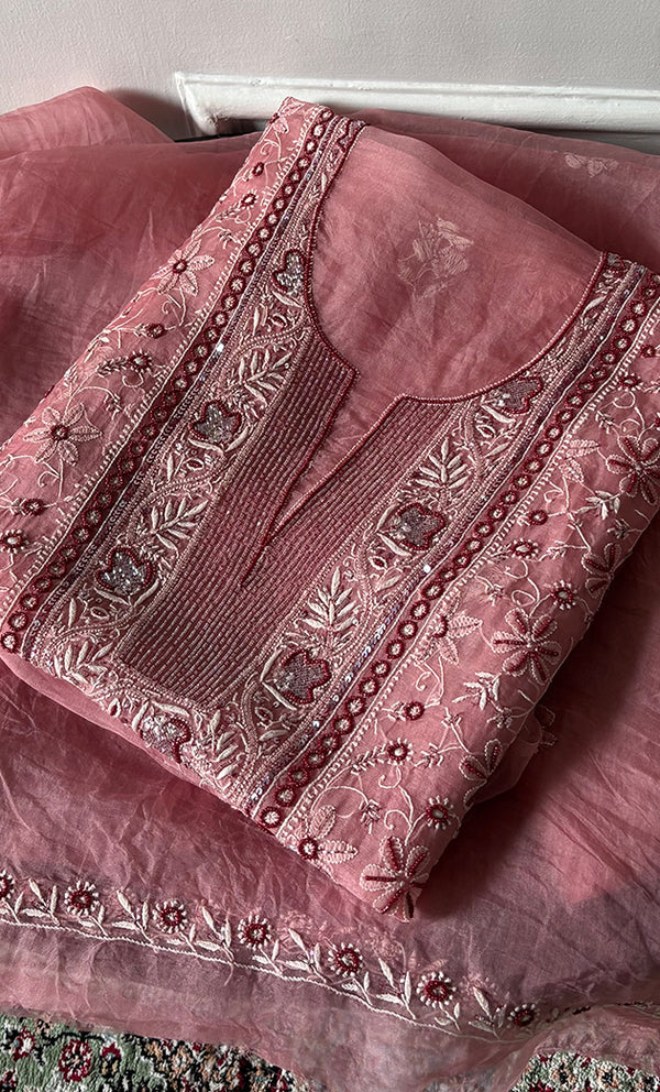 Women's Lakhnavi Handcrafted Pure Organza Chikankari Unstitched Kurta And Dupatta Set- HONC0319970
